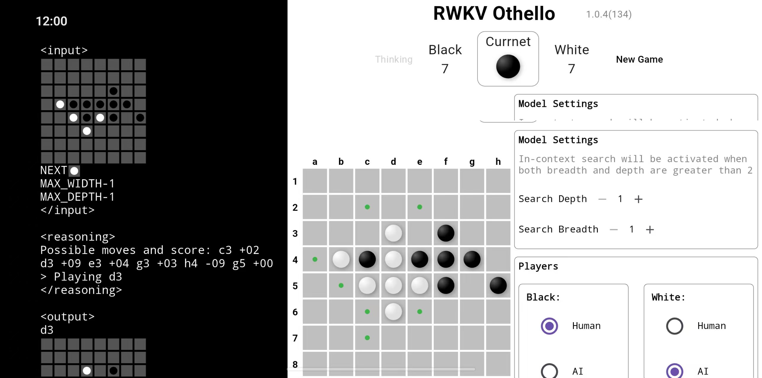 一款能与AI对弈的端侧黑白棋游戏!搭载的RWKV-7模型能够预测合理走法、评估棋局形势,并执行上下文搜索。并且,游戏性能会随推理时输入的 token 数量增加而提升!RWKV 黑白棋无需联网,快来试试你能否战胜AI吧!
